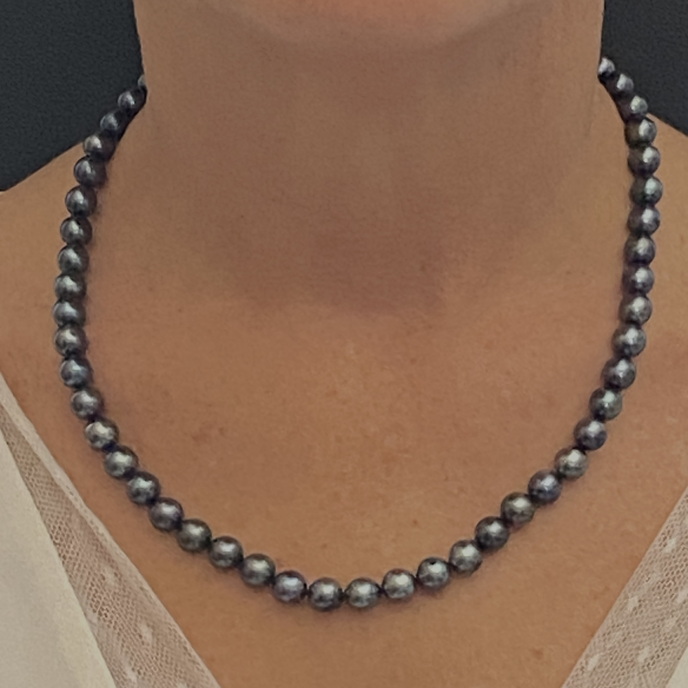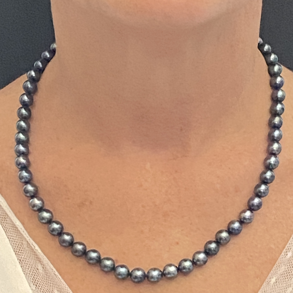 7-7.5mm AAA Quality Japanese Akoya Cultured Pearl Necklace in Black-Silver